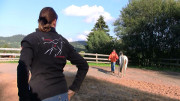 Stallbesitzer abgesprochenes "Reha-Konzept". Zusammenarbeit ist hier die Devise, bei der eine Person die Zügel in der Hand, sowie die Kommunikation und